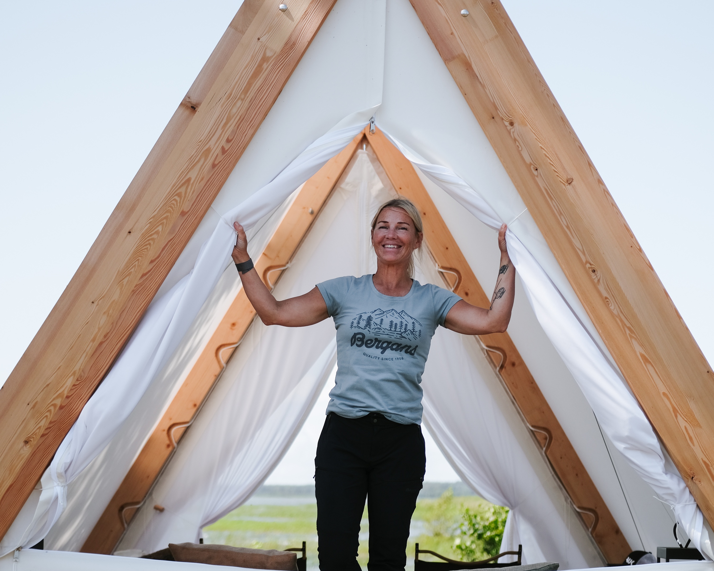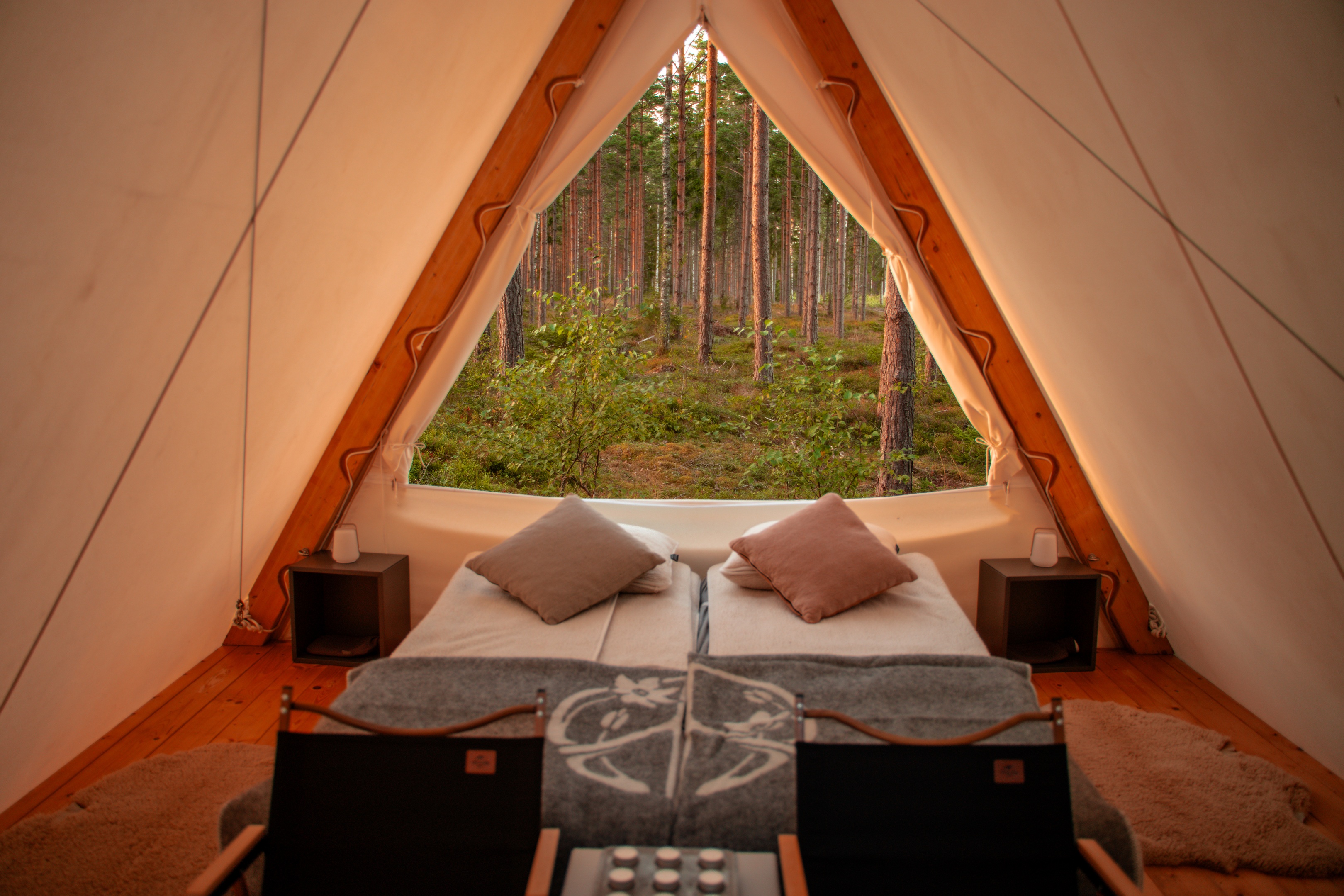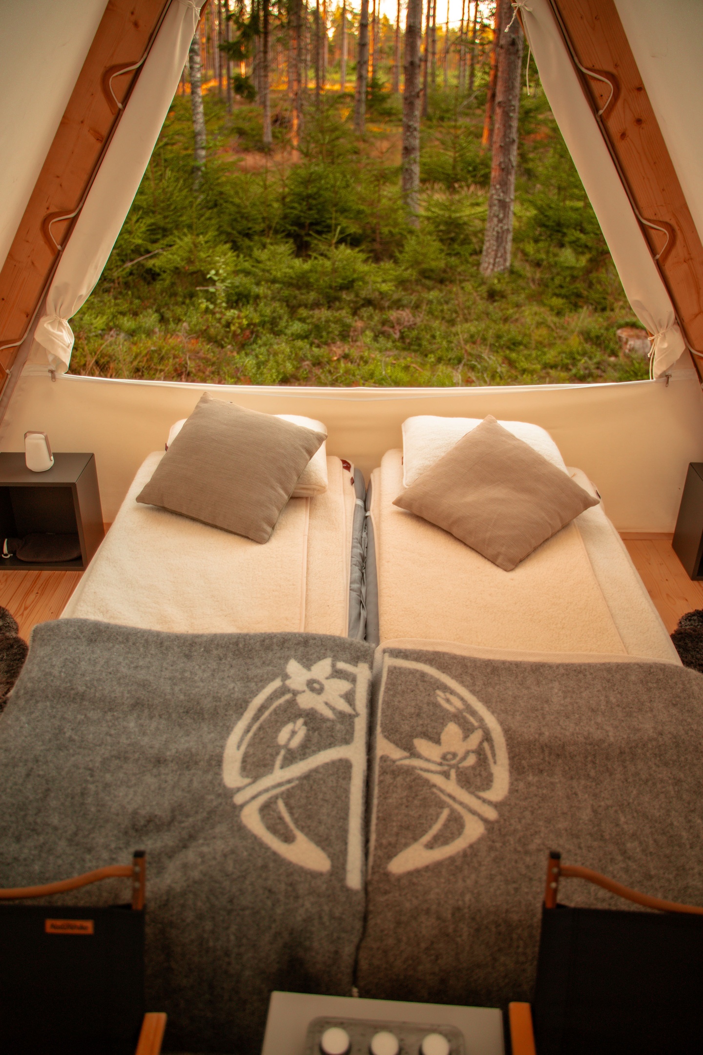 Våra tält som rymmer 2 personer, och det är tyvärr inte möjligt med extrasängar. Om ni är 3 personer kan ni enkelt reservera 2 tält!